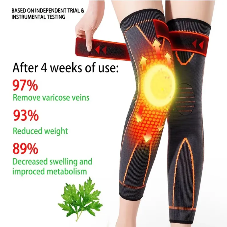 Self-heating leg sleeves that provide natural warmth and shaping comfort for tired, heavy, or tense legs.