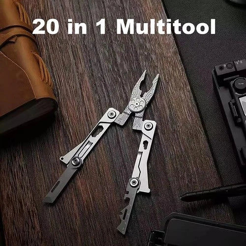 Stainless steel wallet-sized multi-tool integrating up to 20 different functions. Ideal for outdoor activities and home repairs in various situations.
