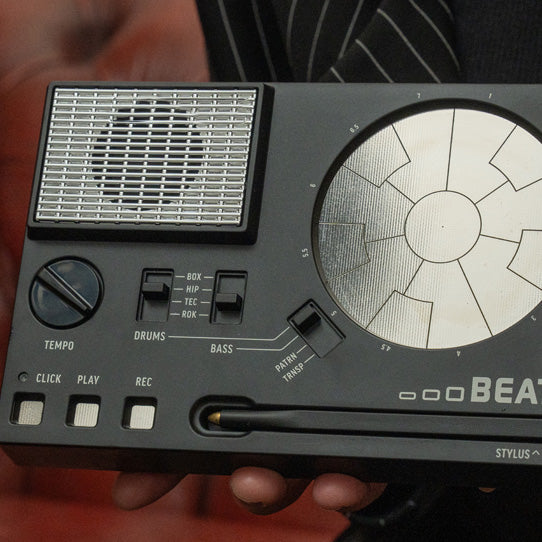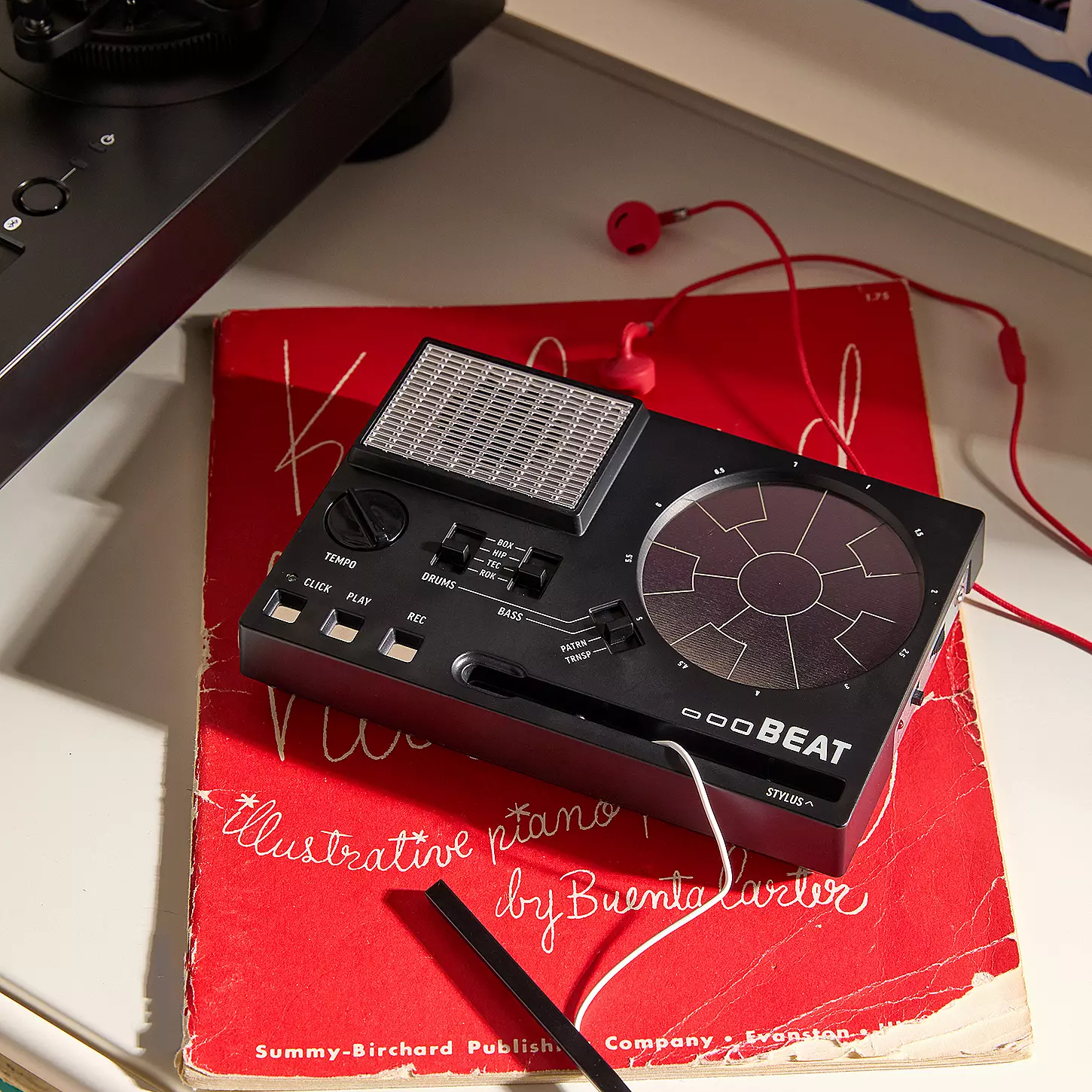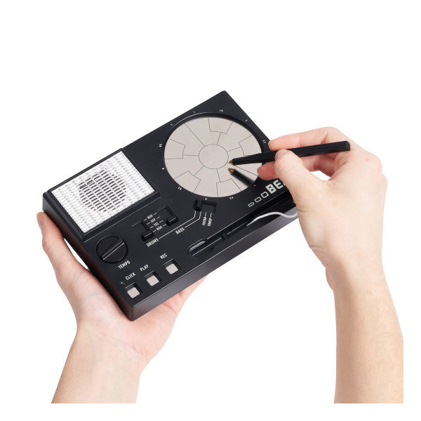 Compact rhythm machine with 4 drum kits and 4 bass sounds—create beats anywhere with stylus control.