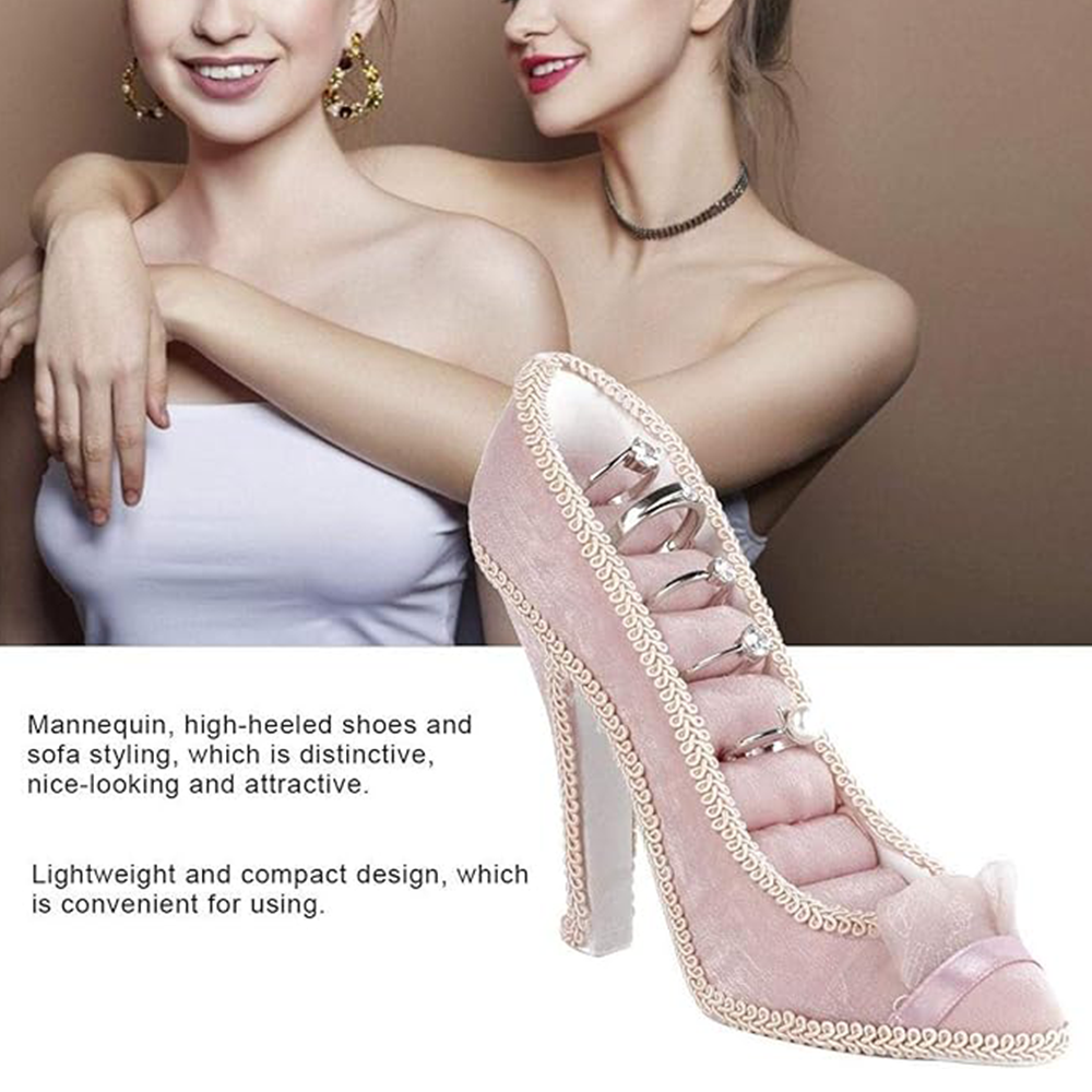 The shoe's heel, toe, and platform are precisely contoured to securely hold and showcase rings of various sizes, from delicate bands to statement cocktail rings.