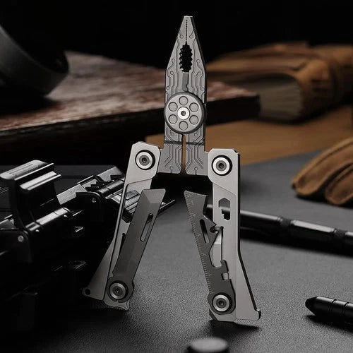 Stainless steel wallet-sized multi-tool integrating up to 20 different functions. Ideal for outdoor activities and home repairs in various situations.