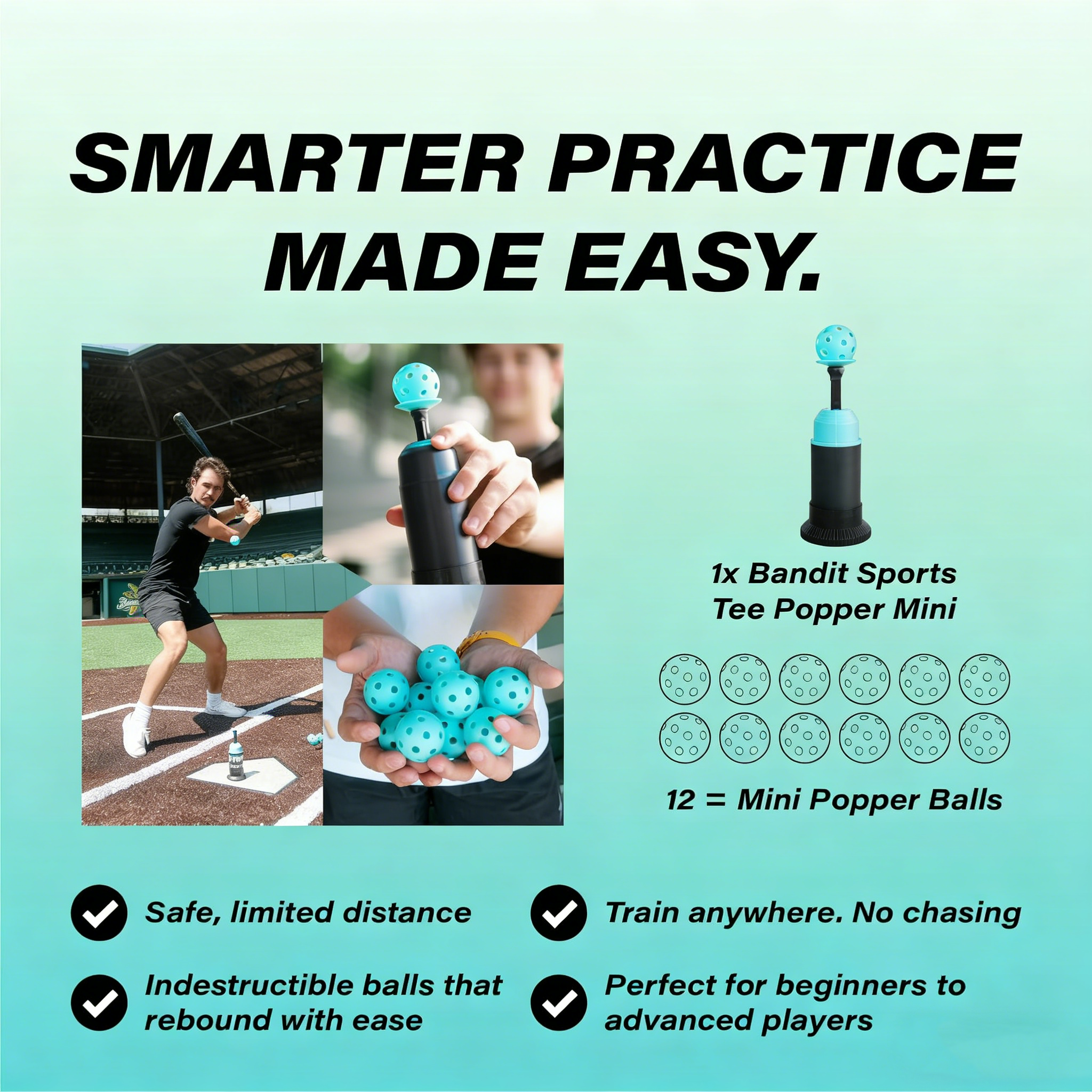 Train anytime, anywhere—no partner needed. Ball pops up to simulate live pitching for realistic batting practice.