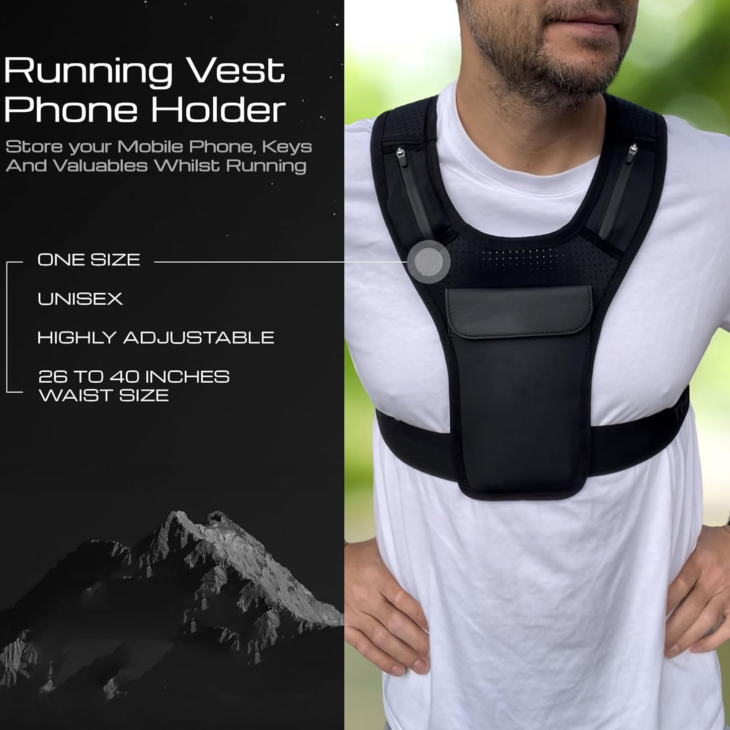 Running Vest Phone Pouch – Unisex, One Size, Large Phone Pocket Chest Bag, Adjustable Belt, 3 Zipper Pockets