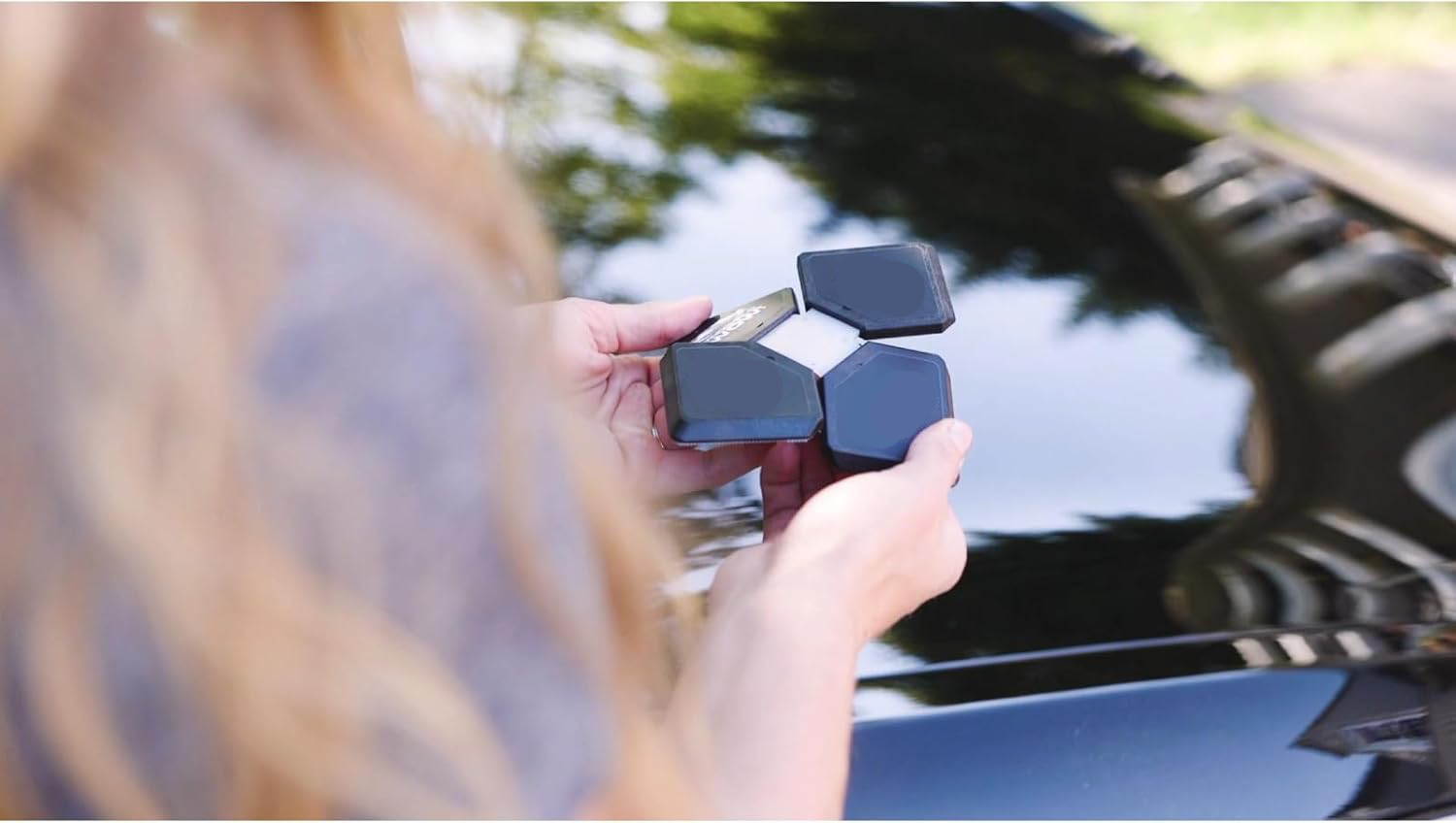 Two cleaning pads — one for the inside and one for the outside — connect through the glass with powerful magnets for synchronized cleaning.